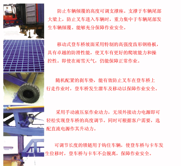 由高度錳鋼矩形管制作的承重梁,有著極高的剛性。坡面采用齒形鋼格板制作,防滑性能。機(jī)身材料經(jīng)過(guò)拋丸除銹處理,并采用耐腐涂料油漆,具有更好的耐銹效果。采用手動(dòng)泵作為起升動(dòng)力,不需外接電源,方便室外使用。